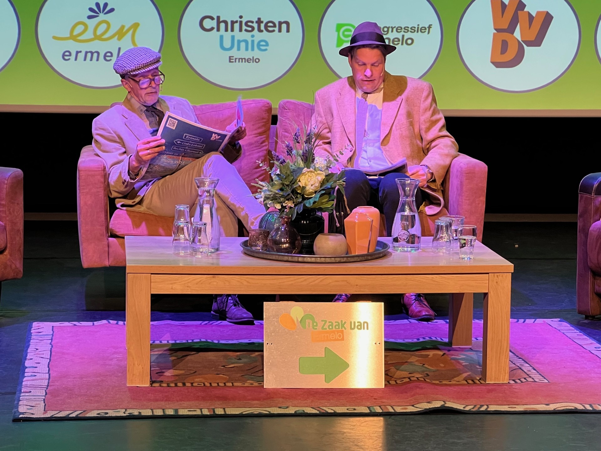 Aankomend weekend hebben wij onze jubileum voorstelling De Vereniging. Ondanks dat we daar heel druk mee zijn, zagen onze Martin en Ronnie nog de kans om op te treden tijdens het lijsttrekkersdebat van Ermelo. Als twee oude heren namen zij de lokale politiek door met verschillende items zoals bv de wolf. Het publiek was enthousiast. Beide heren ook, het was erg leuk om te mogen doen.